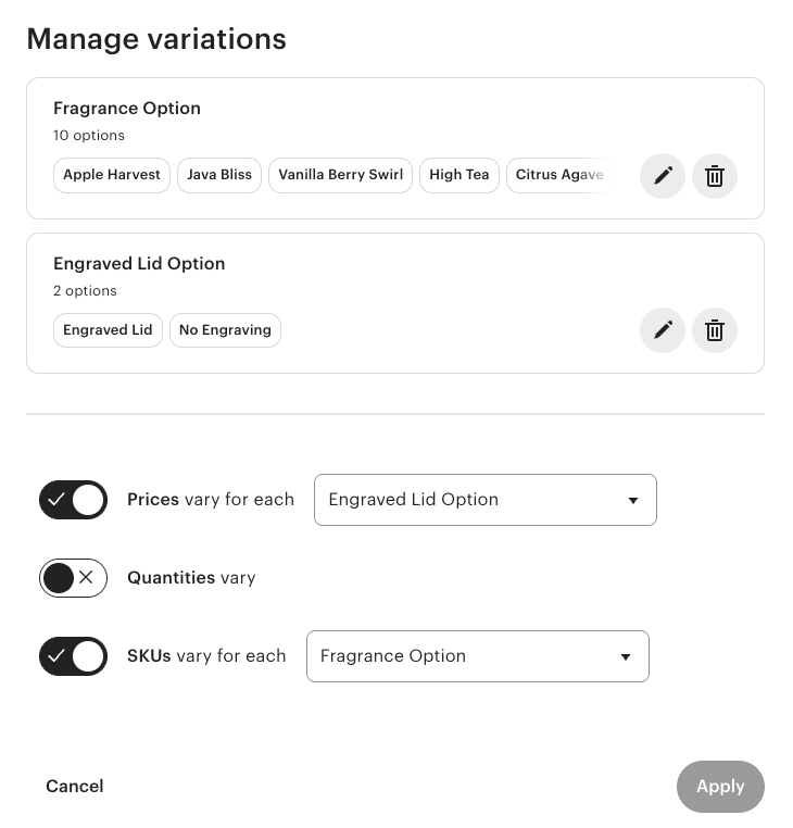 - For candles only half of the variations need to match because you only need one SKU per fragrance, the engraved lid option doesn't matter.