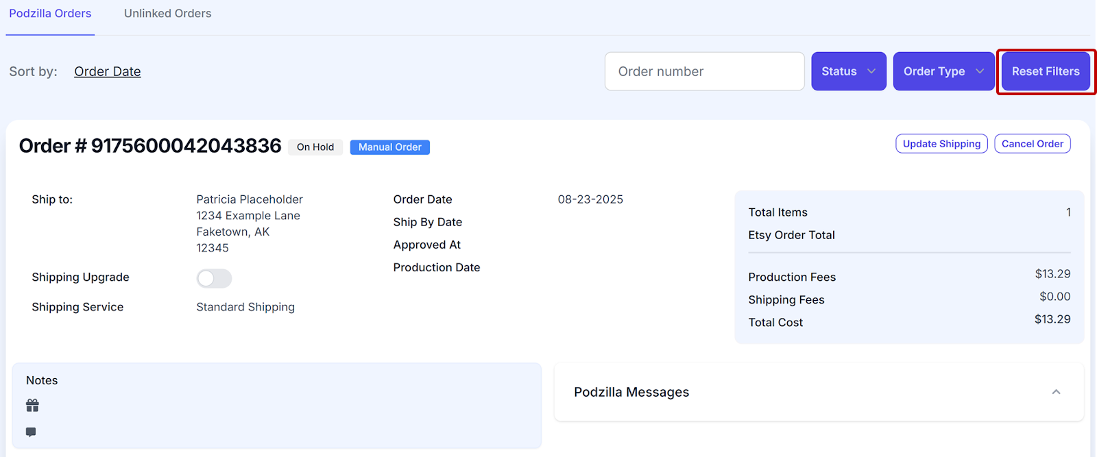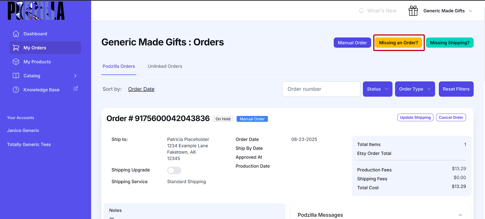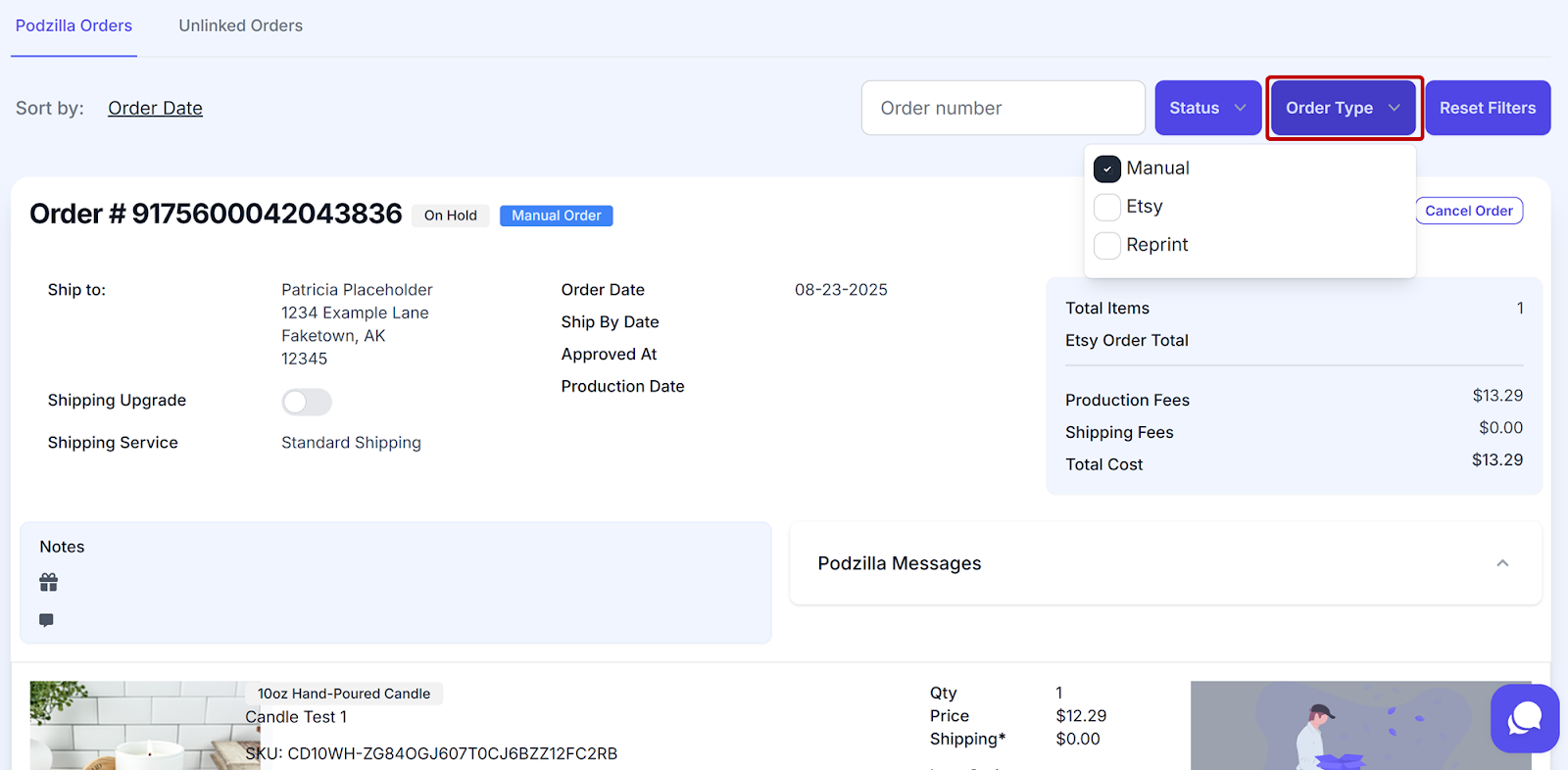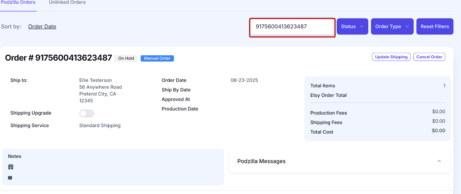 Your order will show up under your Podzilla Orders tab. Notice that the order card shows the order is On Hold and is a Manual Order.