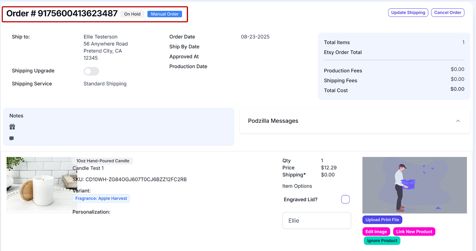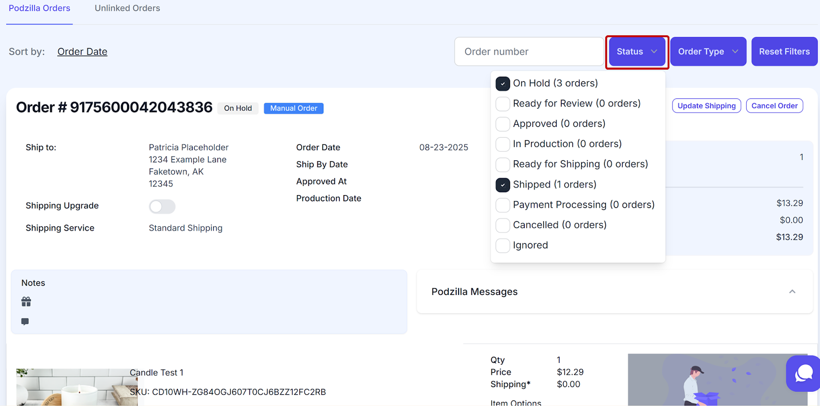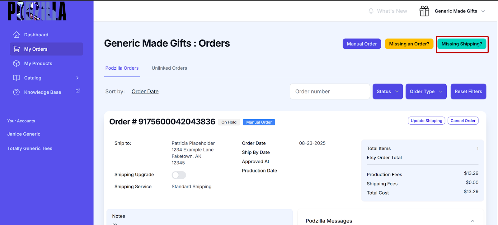 Your order will show up under your Podzilla Orders tab. Notice that the order card shows the order is On Hold and is a Manual Order.