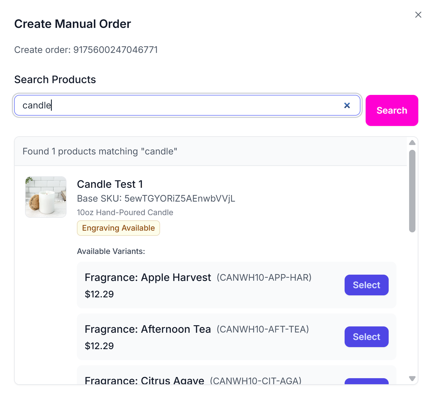 - If you want to add other items to the manual order go back to the search box and search for the next product you would like to add to the order. As you add the items they should show up in the Selected Products section.