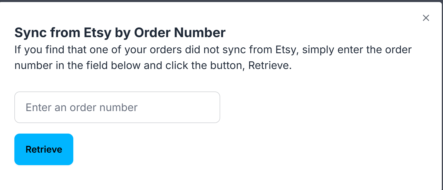 Enter the Etsy order number in the pop-up box and click Retrieve.