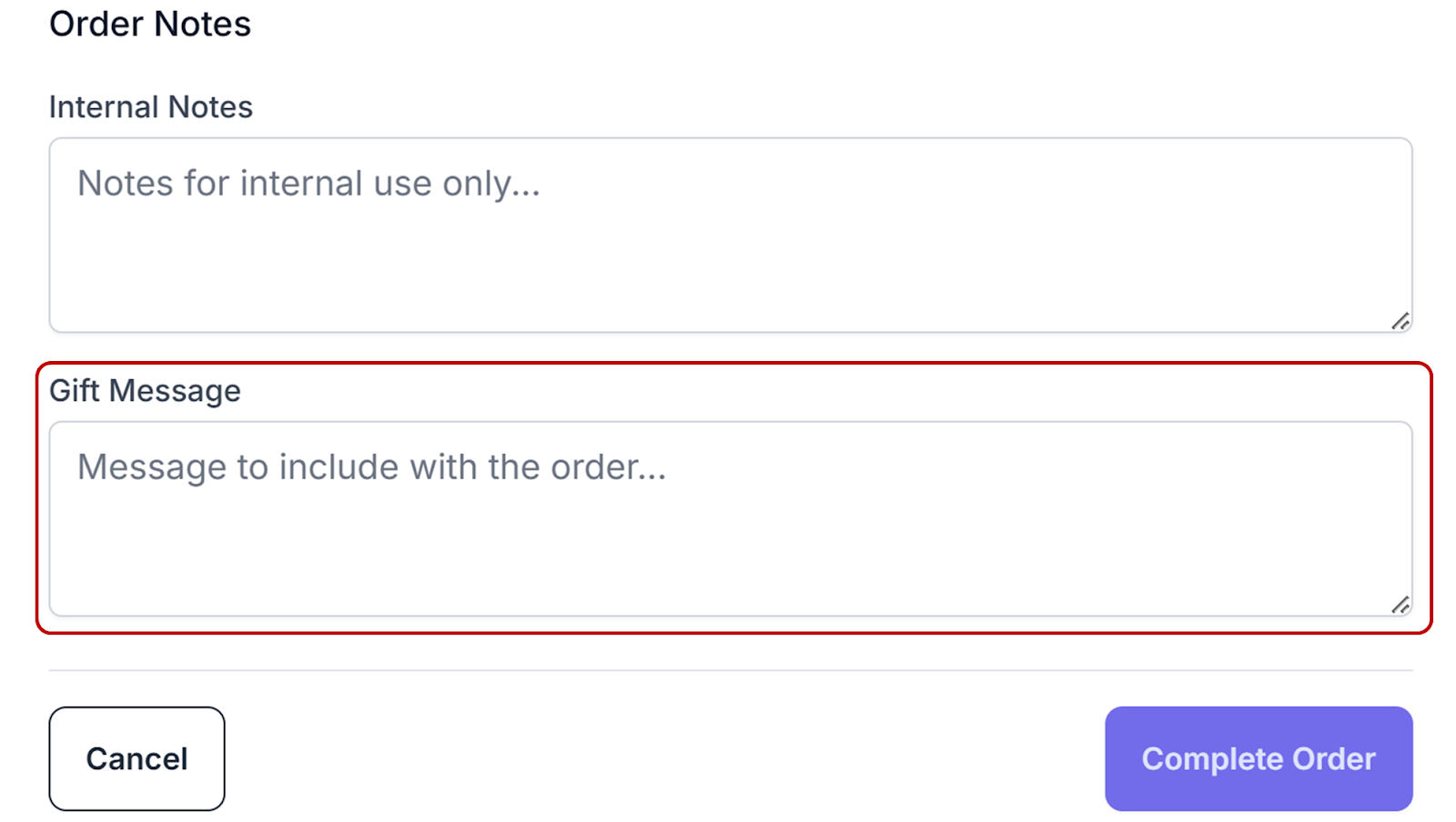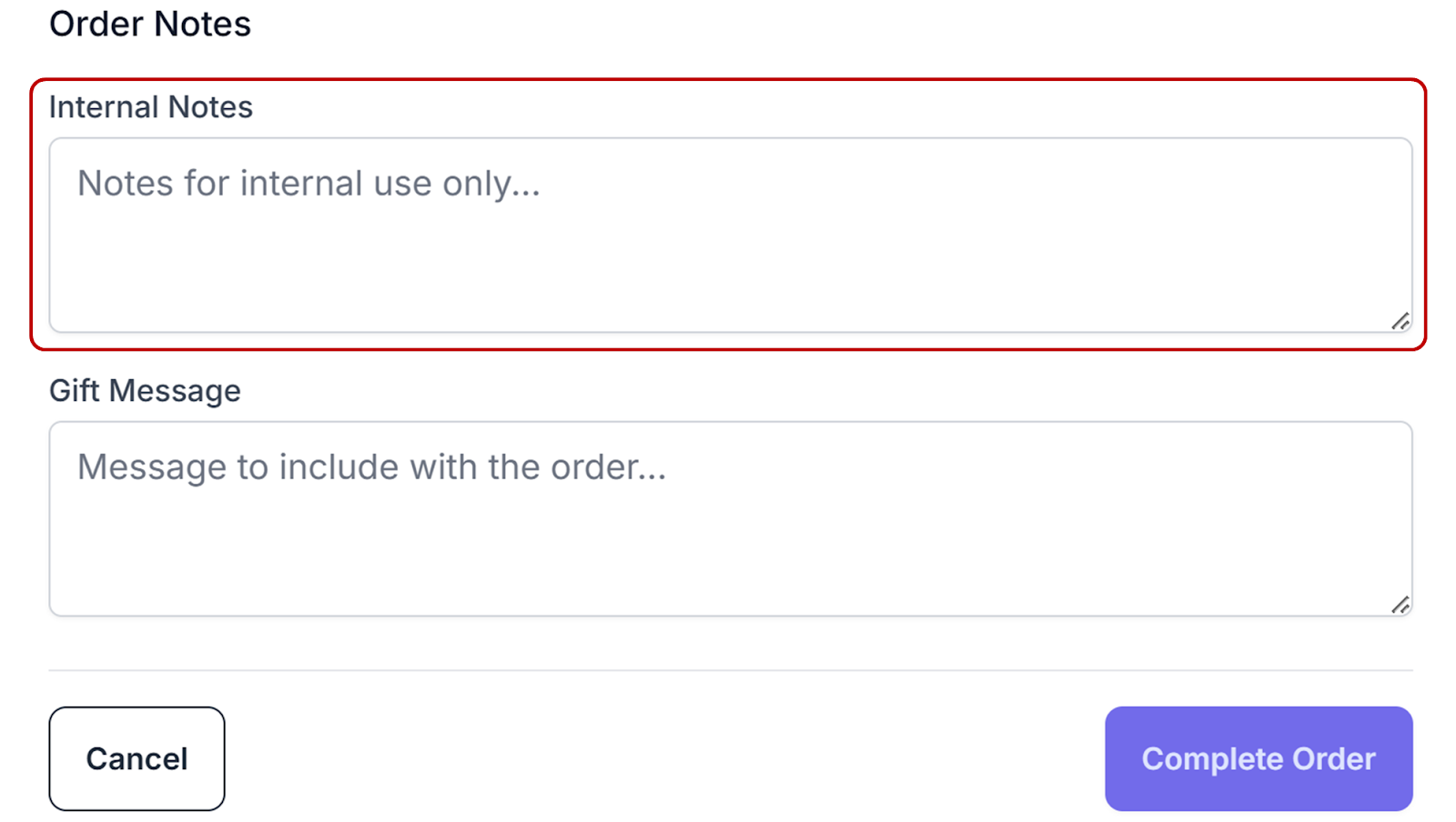 Add any notes for your use or to communicate information to Podzilla for the order in the Internal Notes field. For example, if a customer places two separate orders, but wants them shipped together, you can add a note asking Podzilla to combine the orders when shipping.