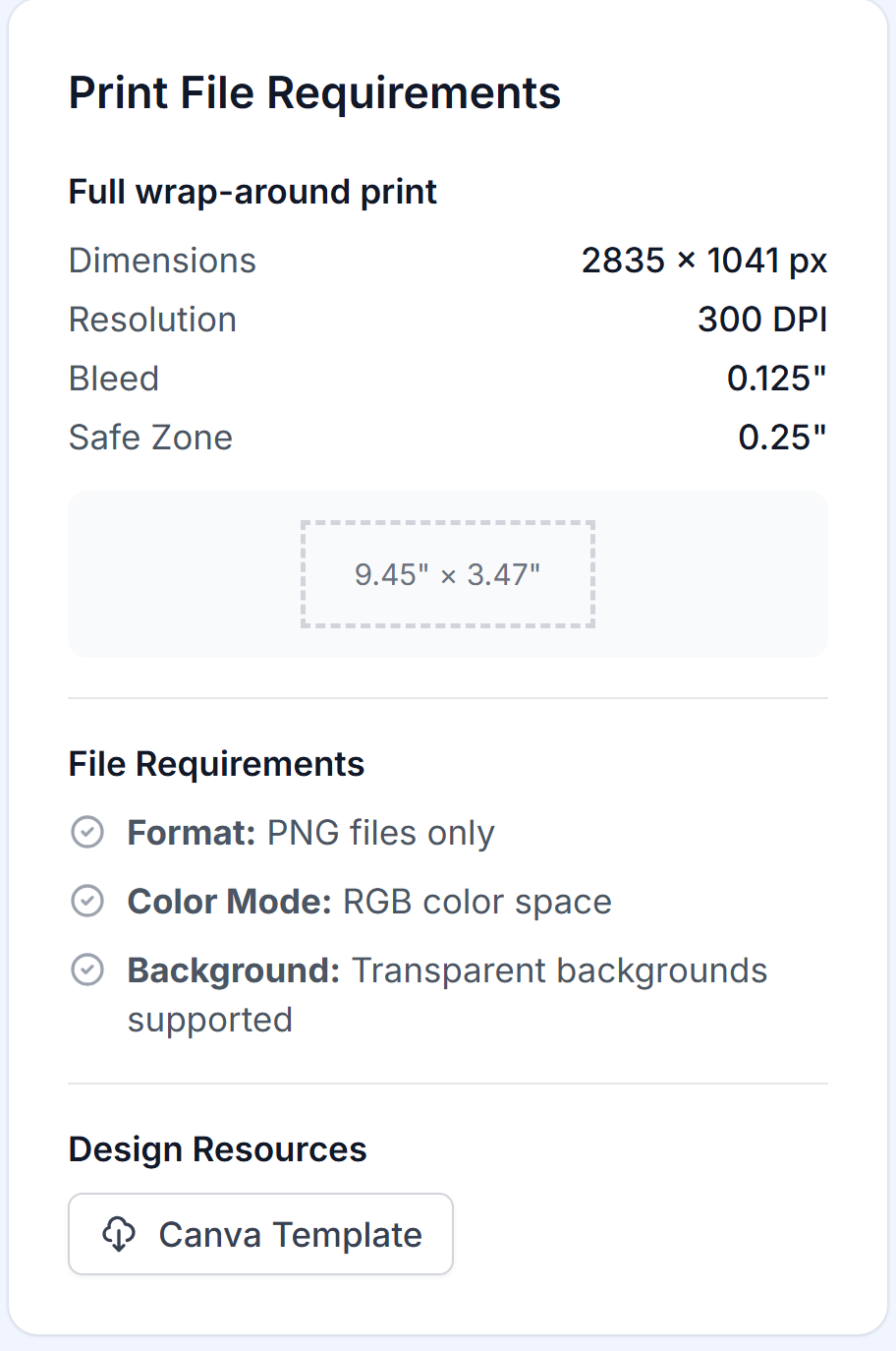 This section gives you the sizing, template, and any other information necessary when uploading your design file.