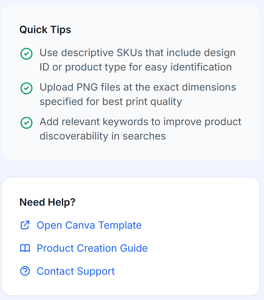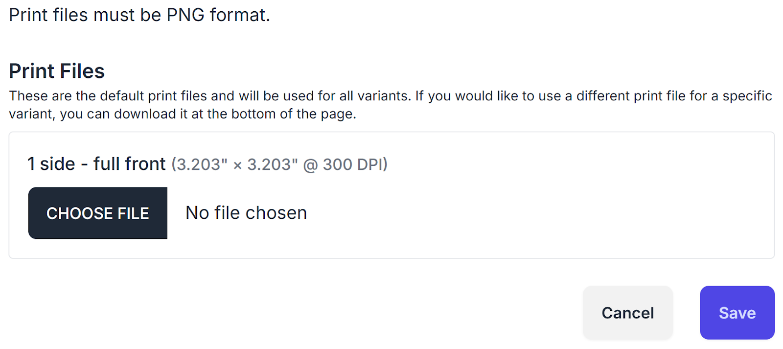 This is where you’ll upload your file to be printed on the product. All files must be uploaded as PNG files.
