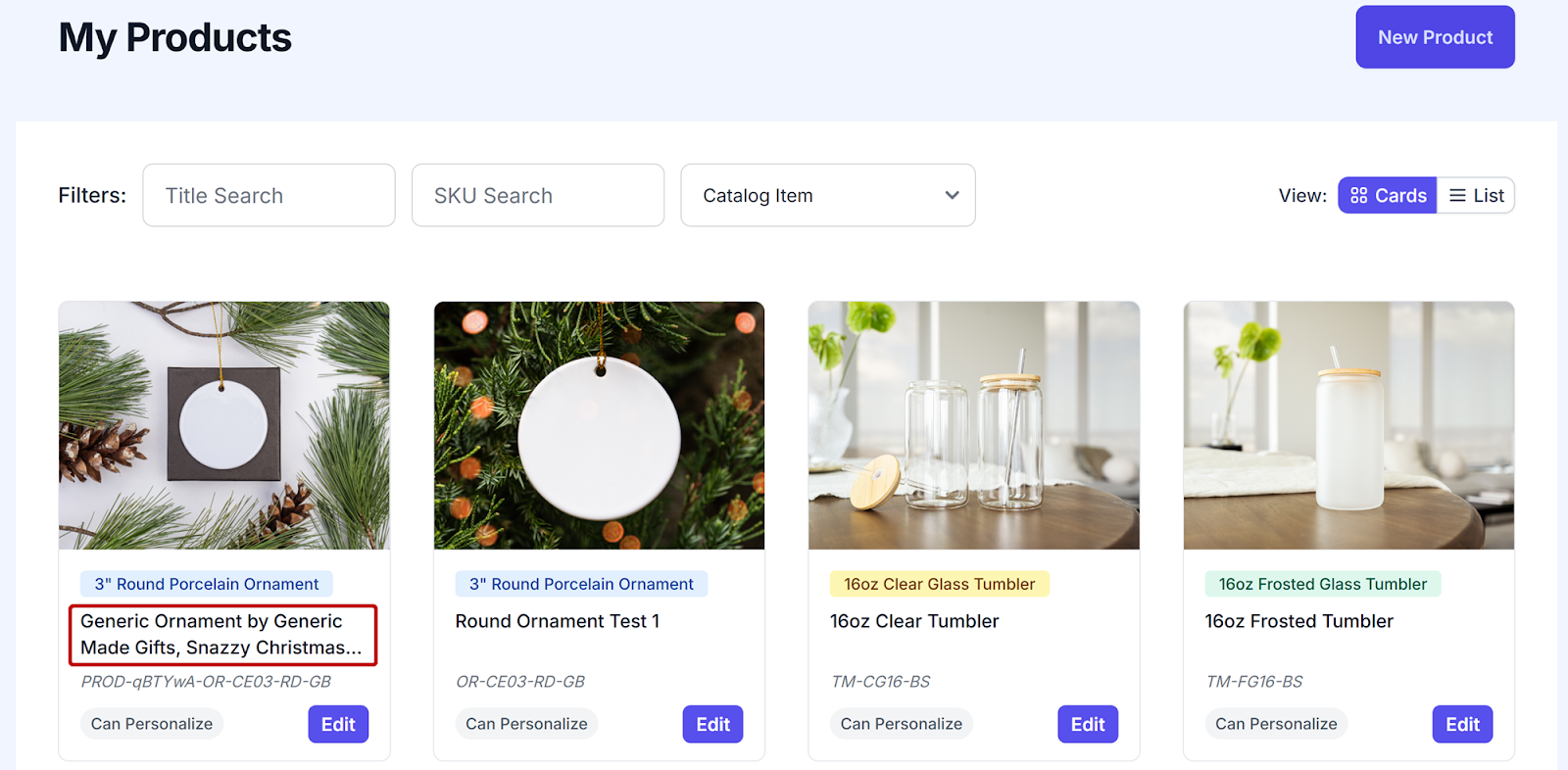 You can also filter your products by the Title, SKU, or Catalog Item (product type).