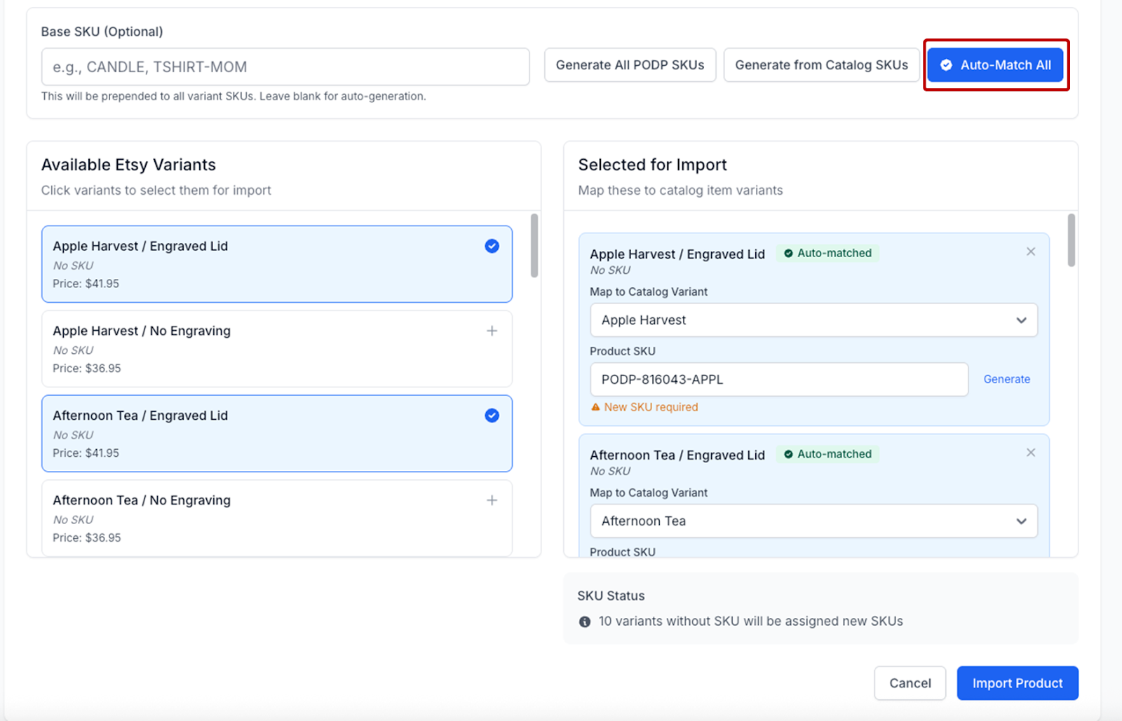 The Auto-Match All button automatically matches your Etsy listing products to Podzilla products.