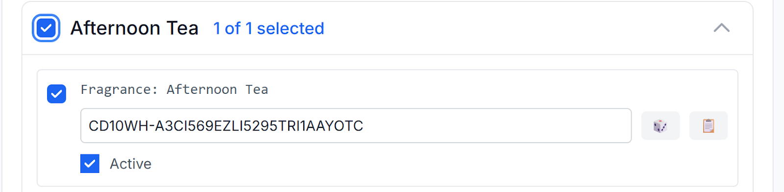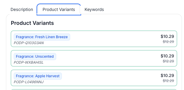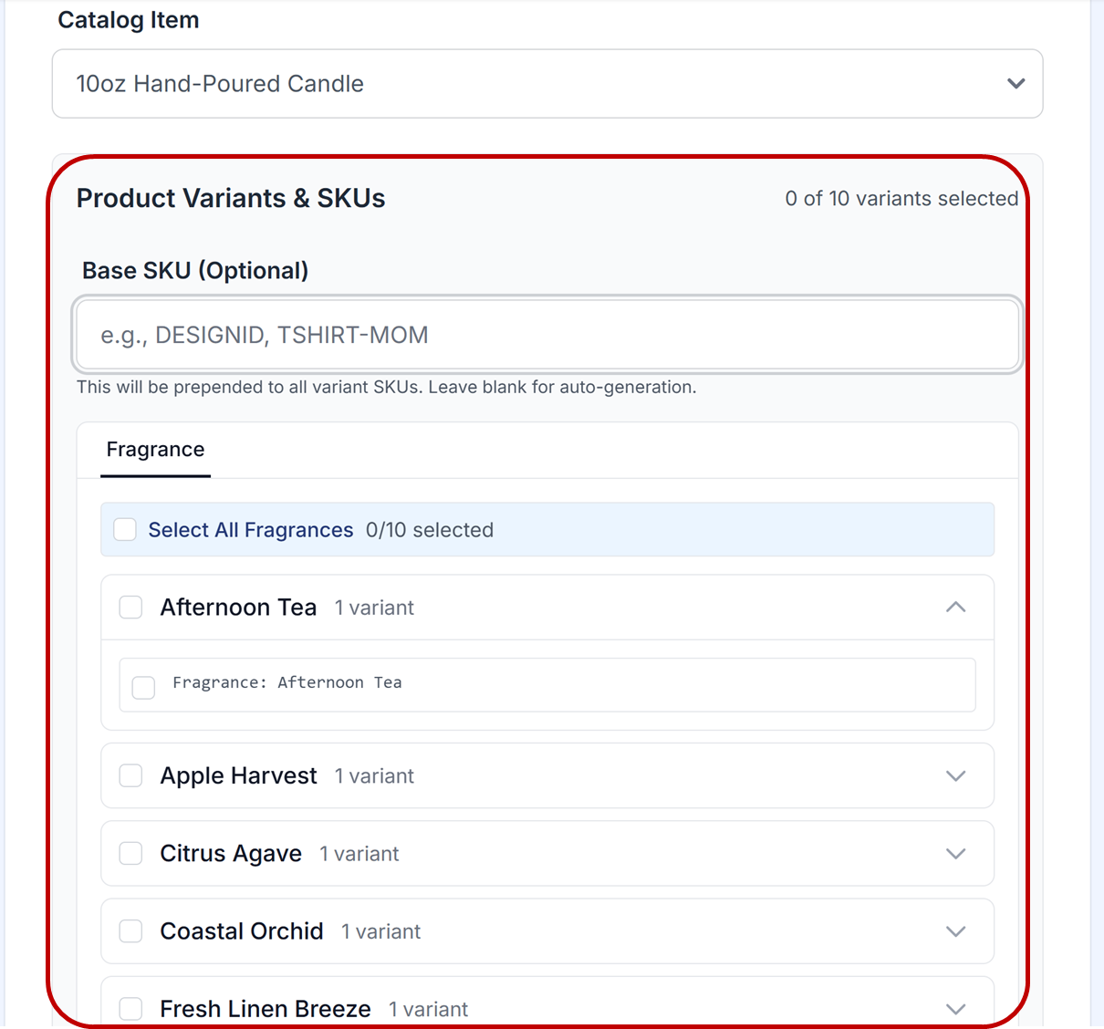 If your product has the option for multiple variants, such as fragrance, color, size, etc., you’ll see your choices in a list below the Base SKU field.