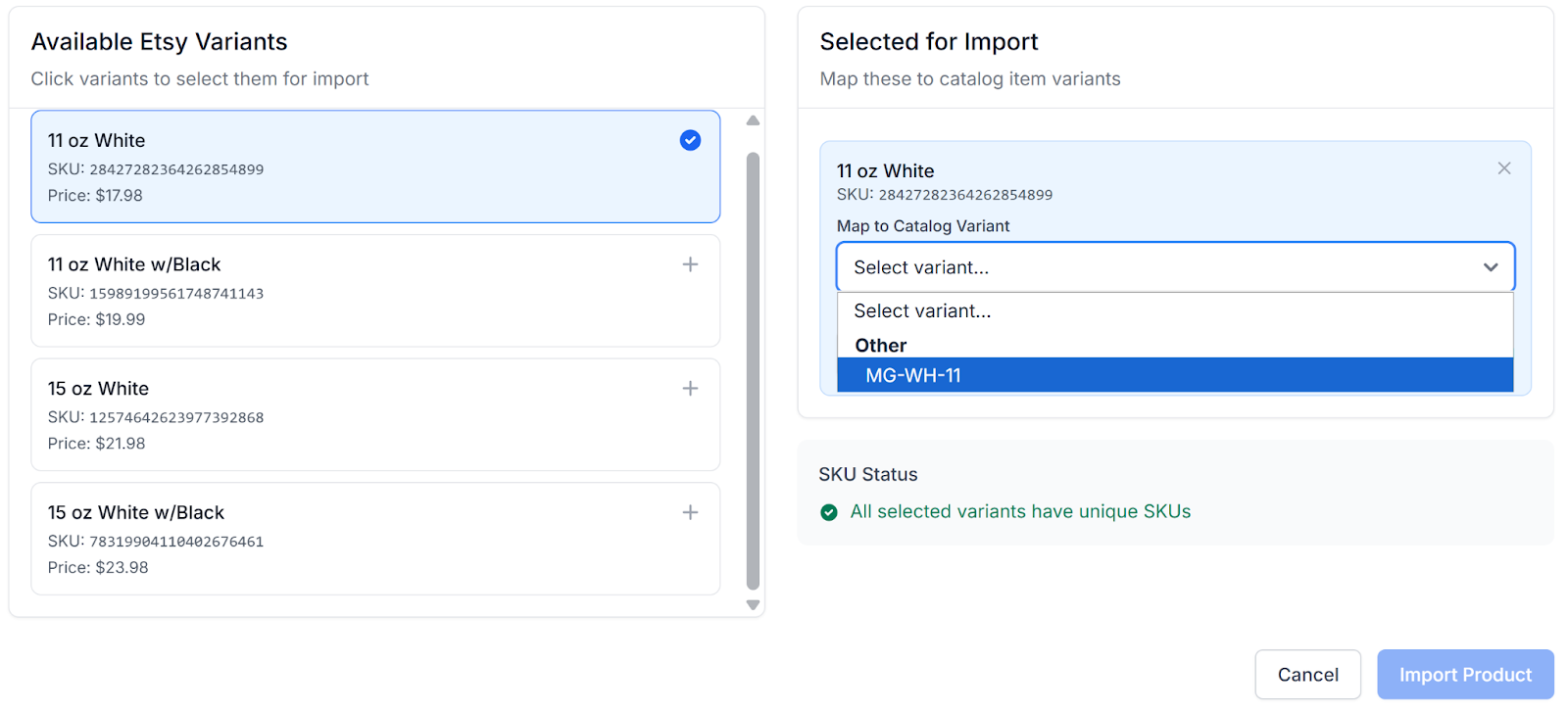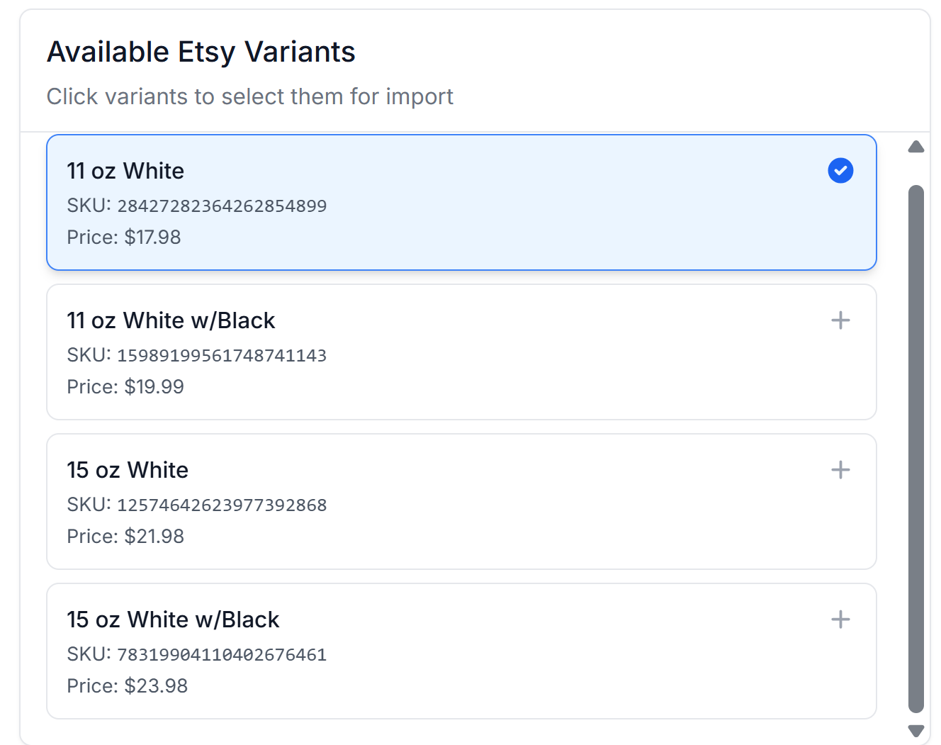 Under Selected for Import, choose the Podzilla product you are connecting to your Etsy listing.