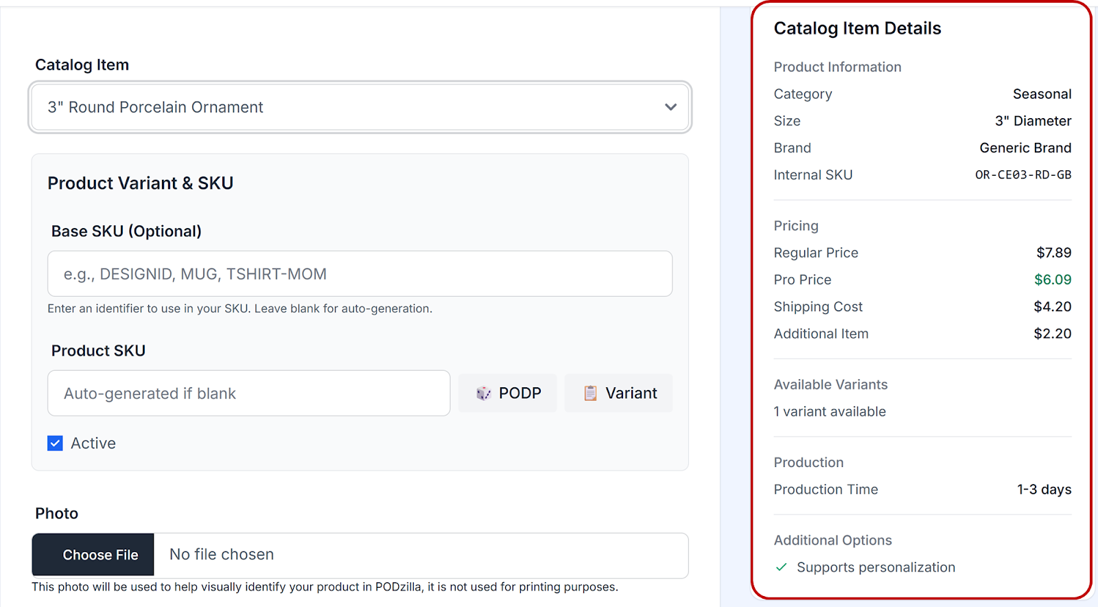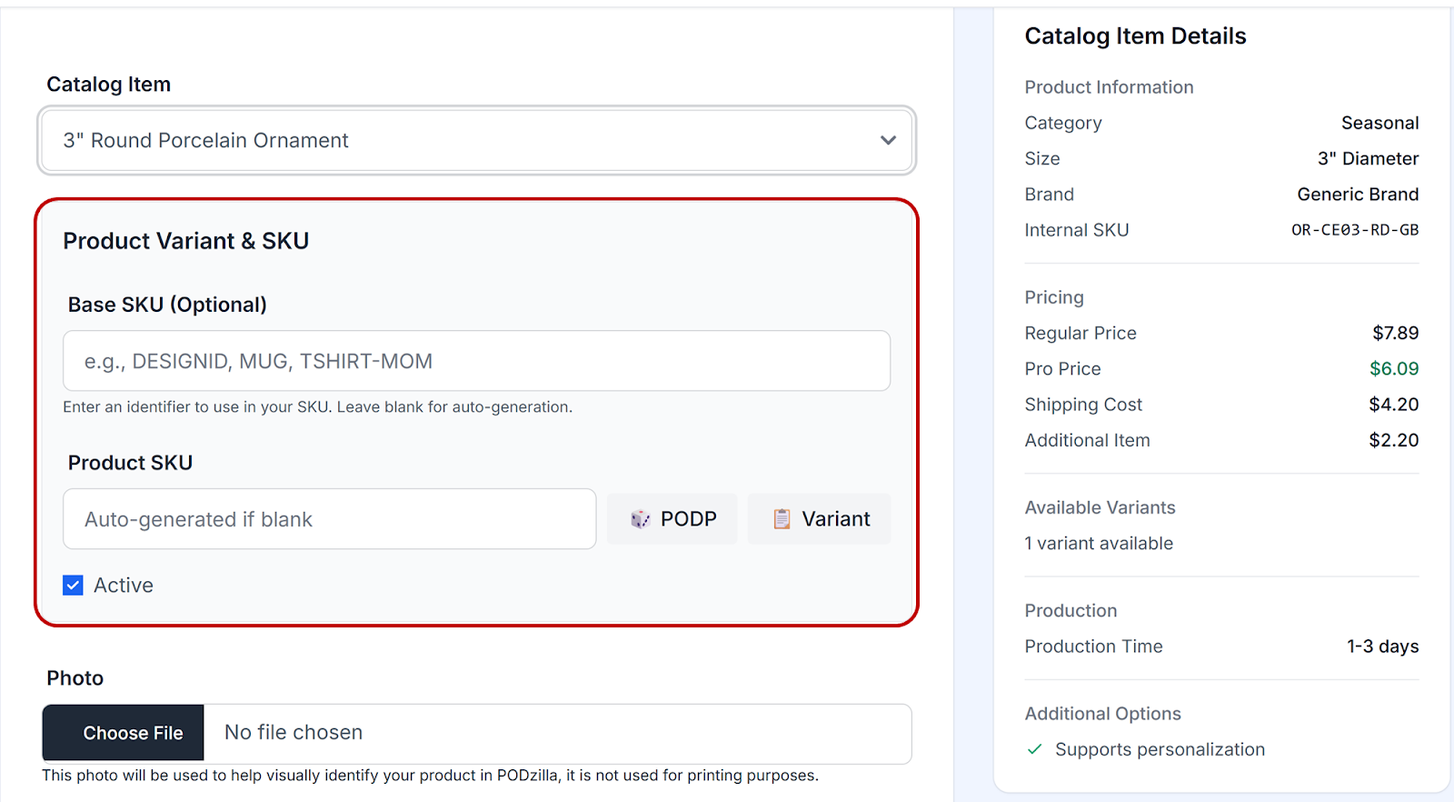 Click the Variant button to add the Podzilla-designated ID to the end of your base SKU. For example, D0093-OR-CE03-RD-GB.