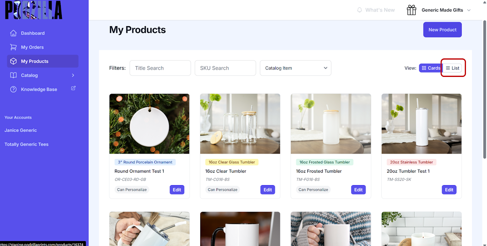 This section is where you see your products and create new ones. The default setting is Grid view, but you can see all your products in a list by clicking the List button.