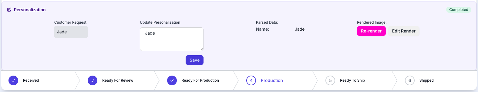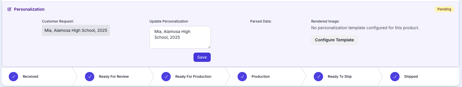 For a personalized order the tool will read the buyer’s personalization note and that area will look like this.