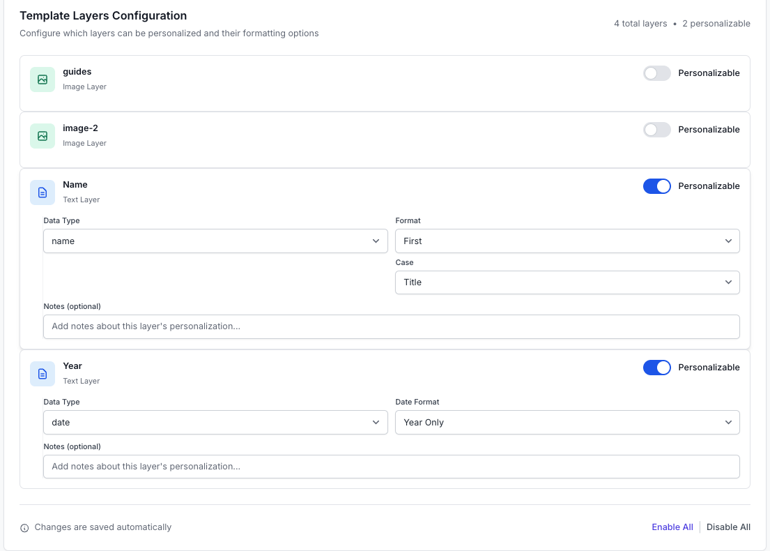 Toggle on any personalized text fields. Set the data type by clicking the drop down menu and selecting what type of personalization it is. Certain fields like Name and Date have additional formatting options to choose from on the right as well.