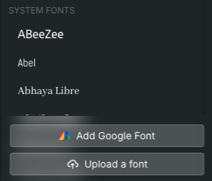 To upload a font go to Text and select “Add a heading” to place a text box on your template. Then click on the font menu in the top menu bar. That will bring up your font library and at the bottom you will see options to upload your own font or add a Google font.