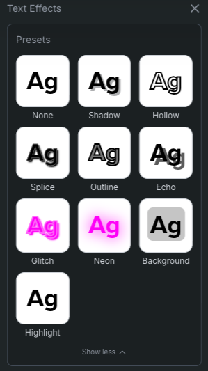 You are able to add text effects in a similar way as in Canva. With your text box selected click the Effects button in the top menu. This will bring up a sidebar on the left with various options. If you click the “Show More” under the top Presets section you will find most of the options Canva offers.
