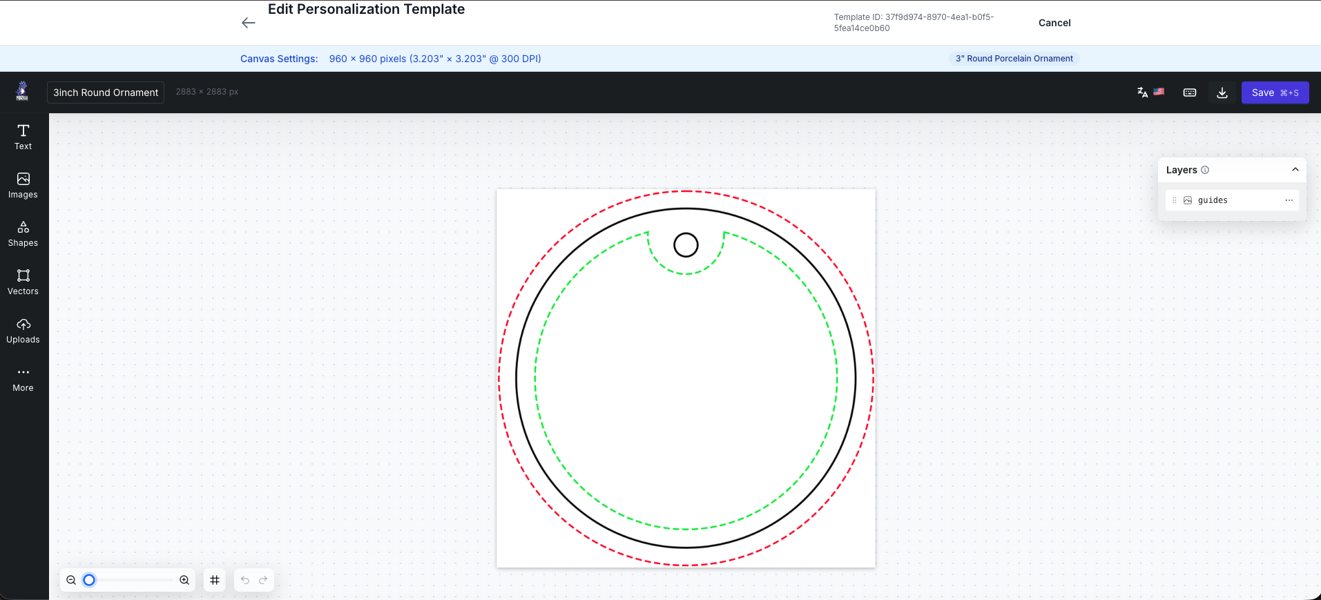 Pro Tip: If your design has several layered graphics that are always in the same place or text fields that do not change (think “Baby’s First Christmas” or “Engaged”) download your design from your design tool (Canva, Kittl…) removing only the personalized text. Upload the design into your template and add the personalized text fields.