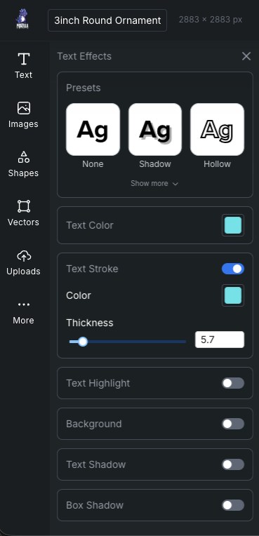 To add a stroke outline make sure your text box is selected and in the Effects menu toggle on “Text Stroke” and select the color you want for your outline and adjust the slider to the desired font thickness.