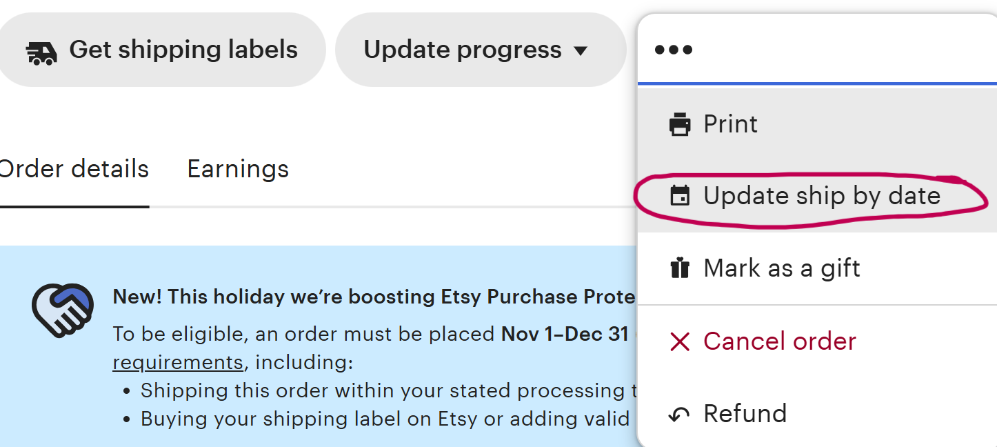 If you have orders approaching the ship by date on Etsy, remember you can extend the ship by date once to account for the delay, so be generous in the date you choose.